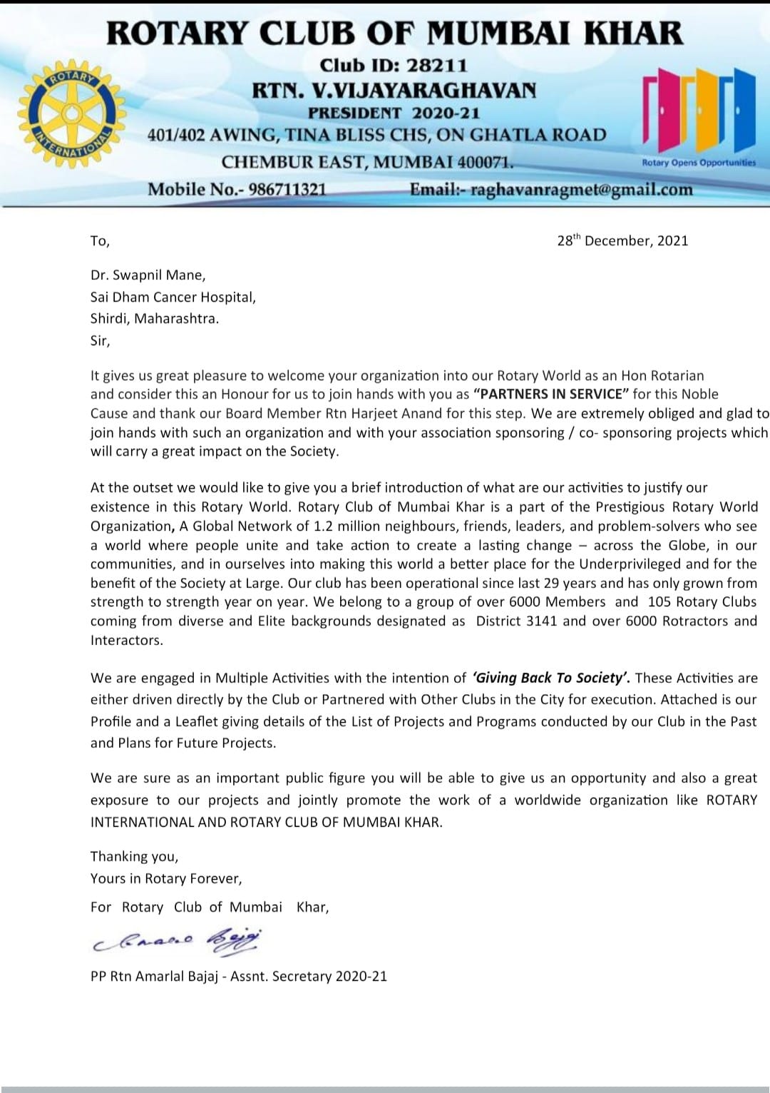 | 9 | Amarlal Bajaj | Assnt. Secretary | Rotary club of Mumbai Khar | 28-12-2021 | View |
